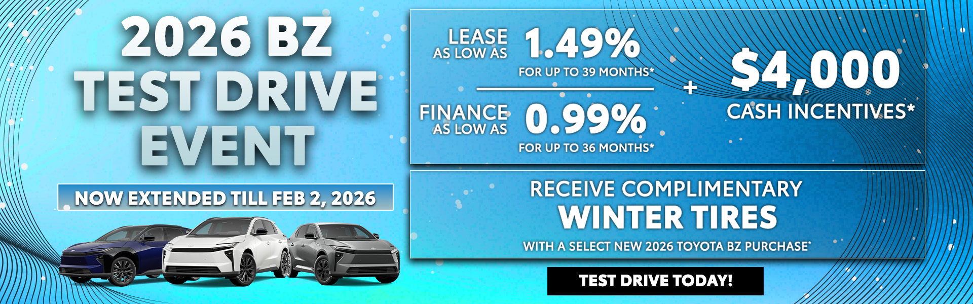 Whether you are EV curious or ready to plug in, our Winter of EV is your opportunity to learn, ask questions, and experience what driving electric is really like during the winter months. From understanding cold weather range and charging, to enjoying a hands on test drive of the new 2026 Toyota bZ, our team is here to help you feel confident and informed every step of the way.